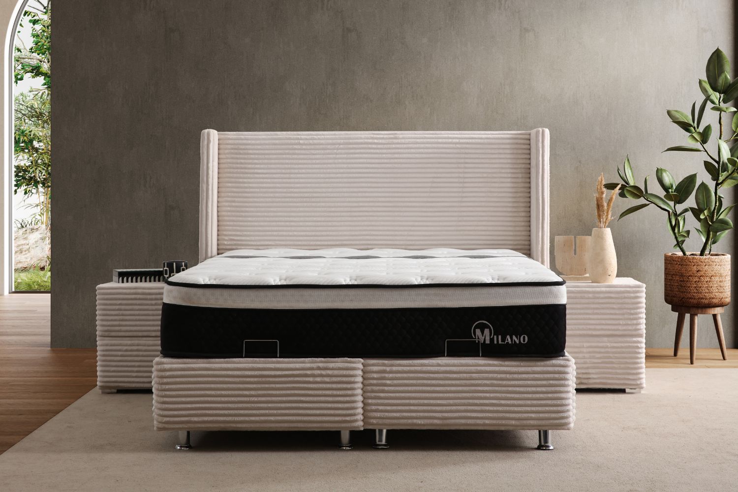 Découvrez le lit coffre CLARA, double coffre en métal renforcé avec 25 cm de profondeur pour un rangement optimal de vos affaires. Recouvert d'un velours côtelé premium, il allie élégance et fonctionnalité. Profitez de son espace de rangement intégré et de son design moderne pour une chambre organisée et stylée.