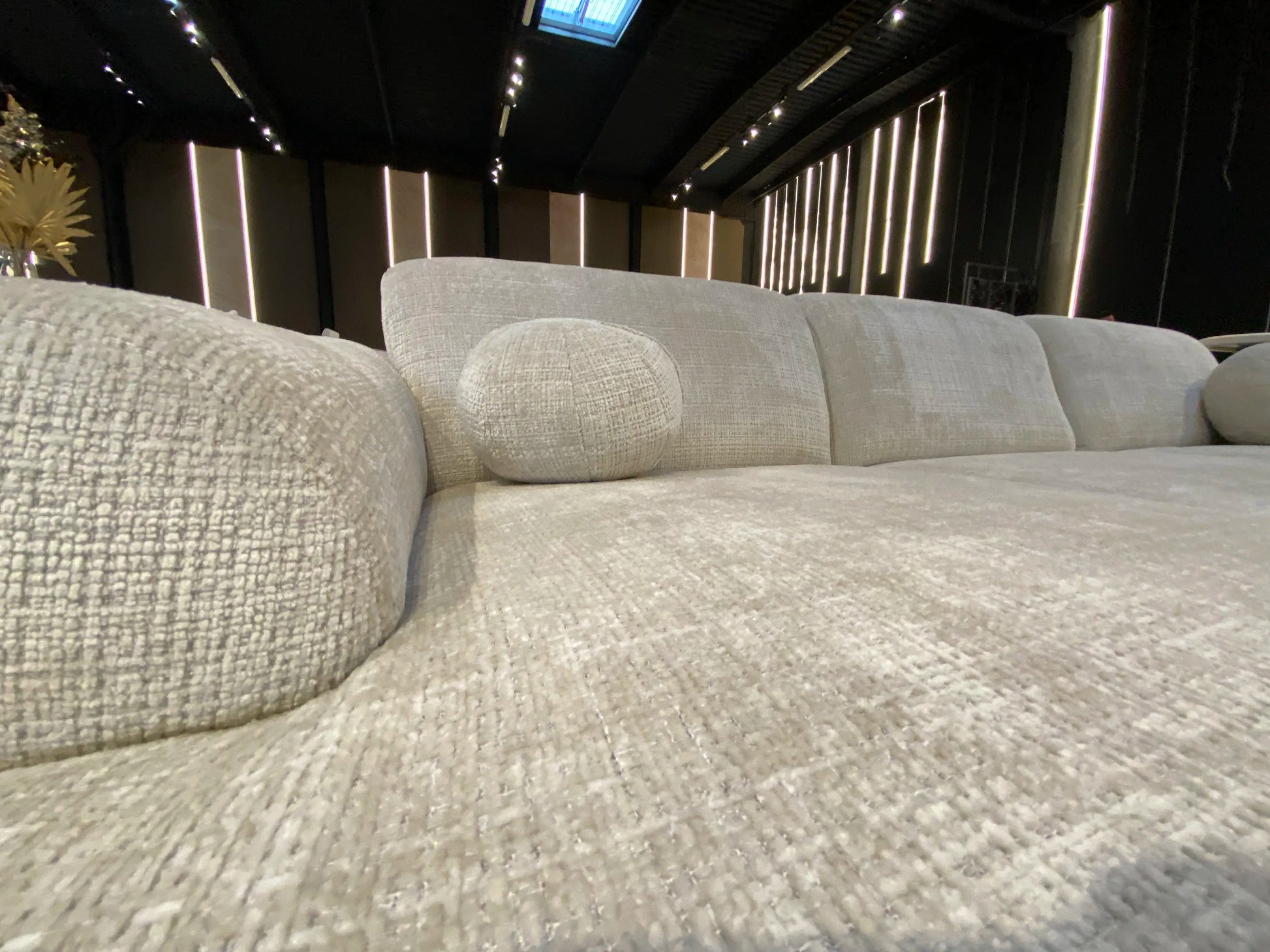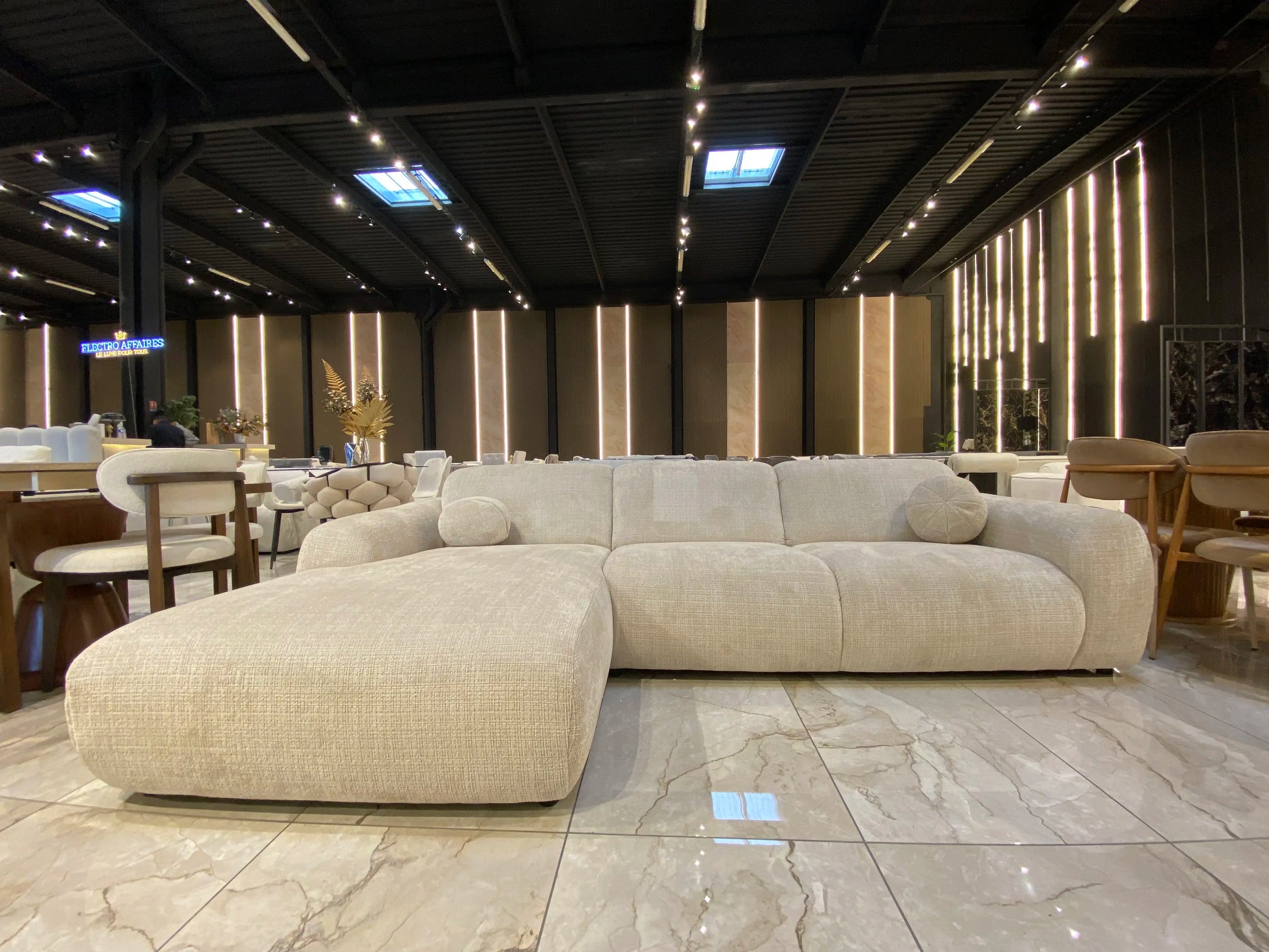 Plongez dans l’élégance avec notre dernière création : le canapé d’angle LOLA, habillé du somptueux tissu Marbella.