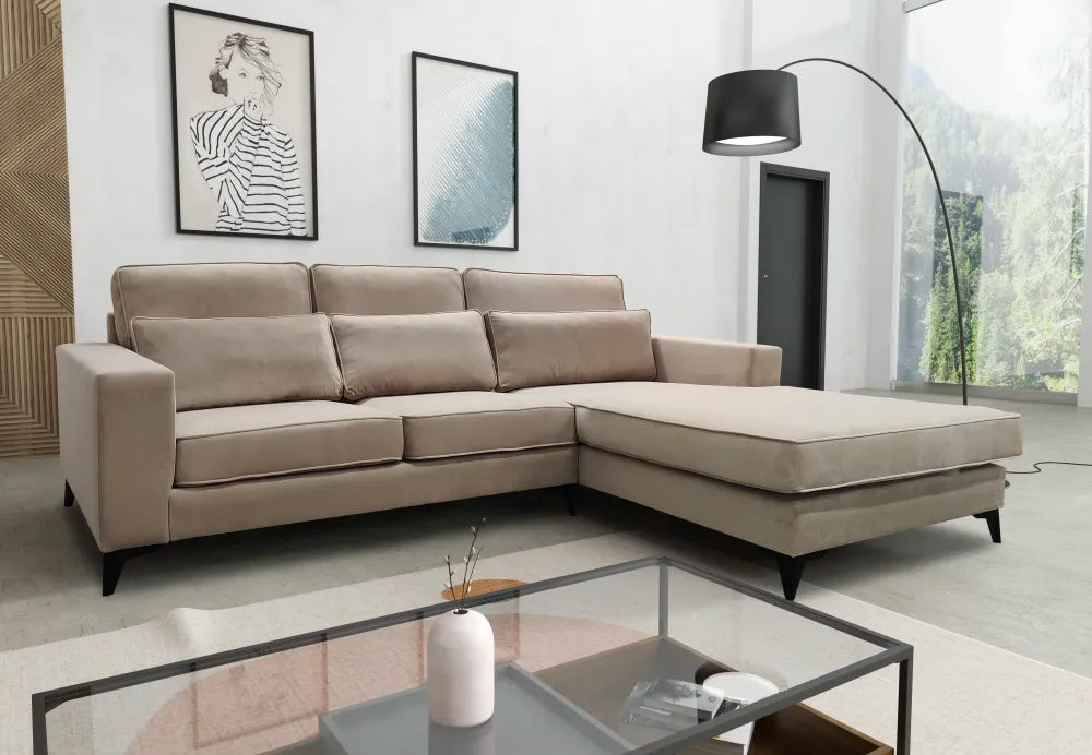 Canapé d'angle MADRID en velours beige, dimensions 265x200 cm (265x268 cm en emballage). Conçu avec une structure bois robuste et un revêtement en velours de qualité, associé à une mousse haute résilience de 35 kg/m³ pour un confort durable et un soutien optimal. Élégance intemporelle pour votre intérieur.