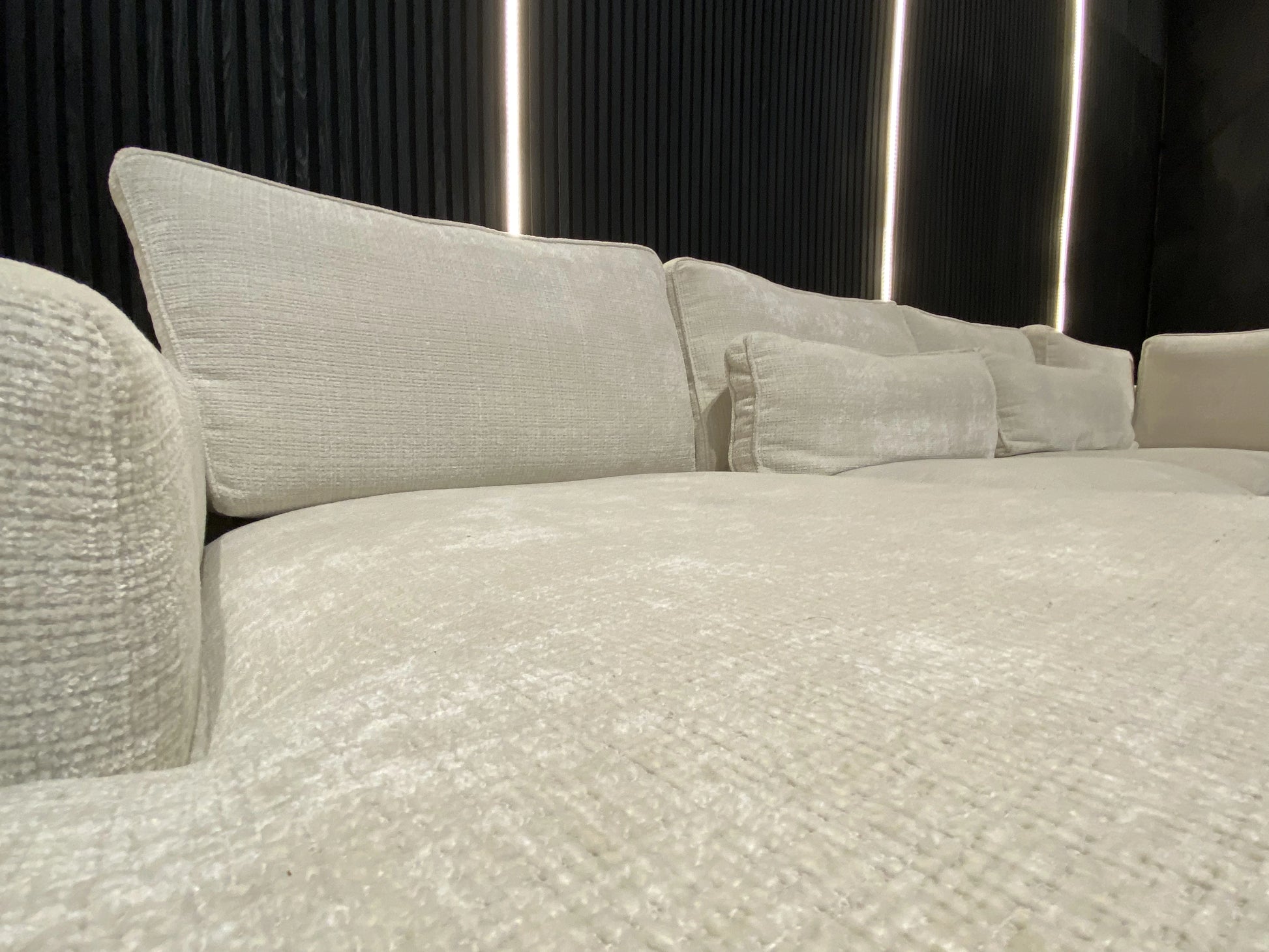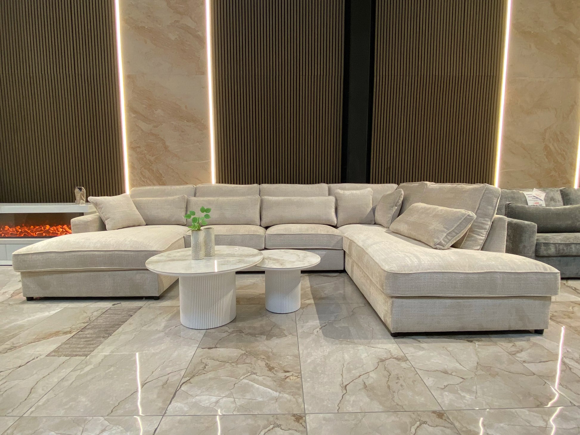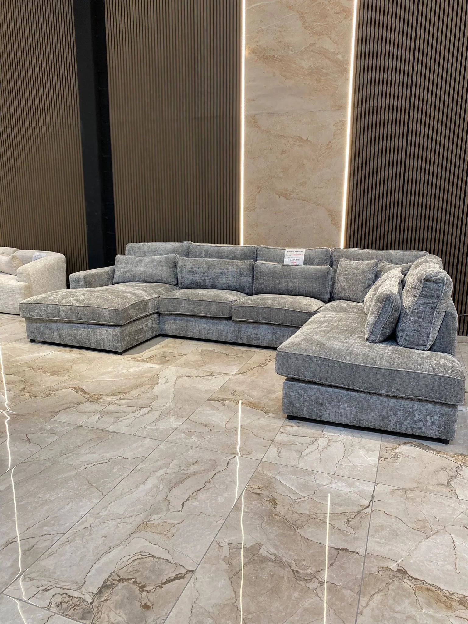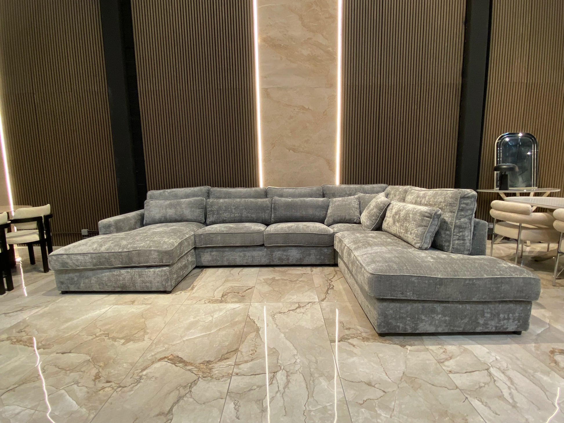 Découvrez notre tout dernier bijou : le canapé en U MARBELLA recouvert du somptueux tissu Marbella avec deux angles possible droit ou gauche.