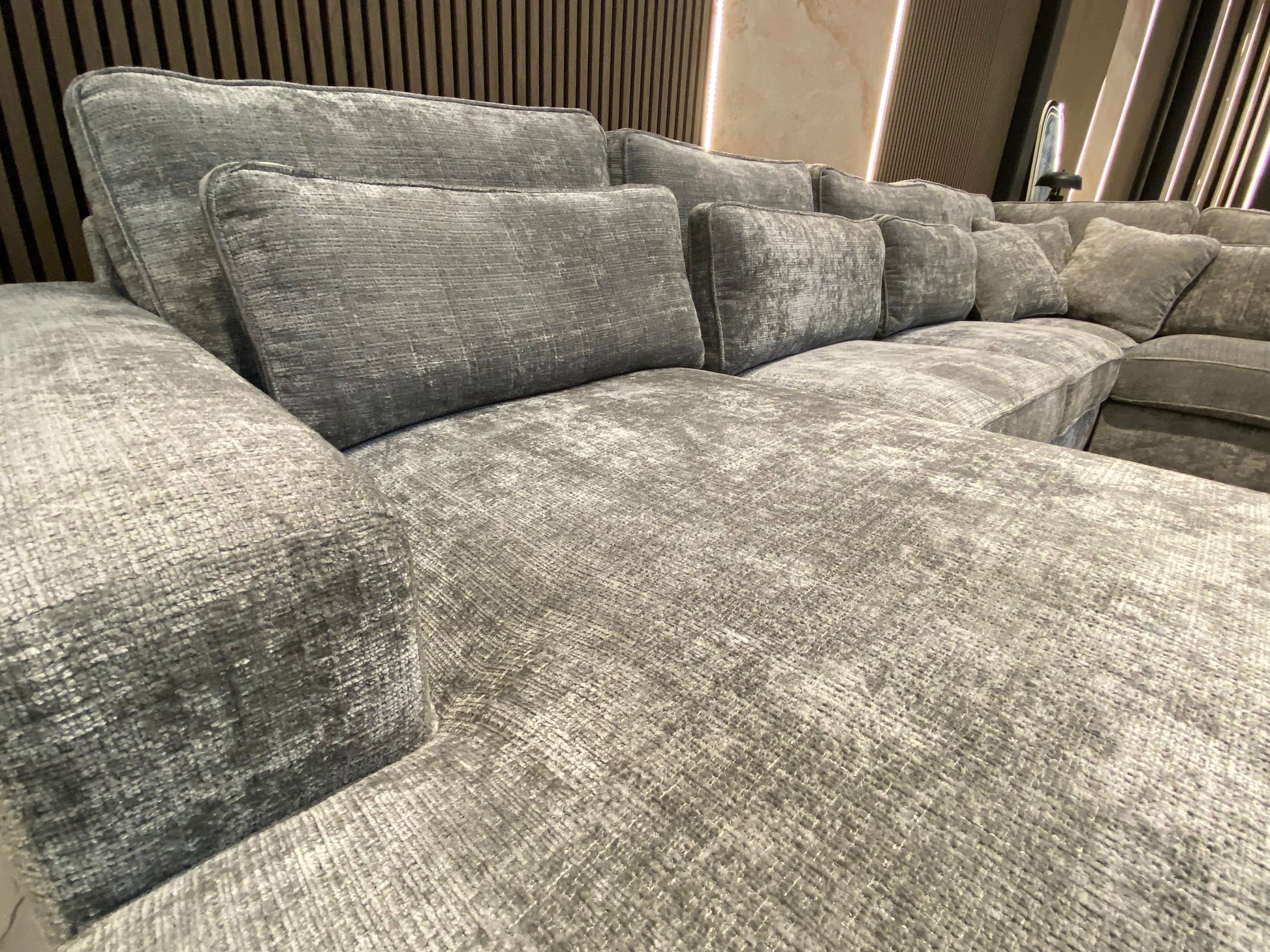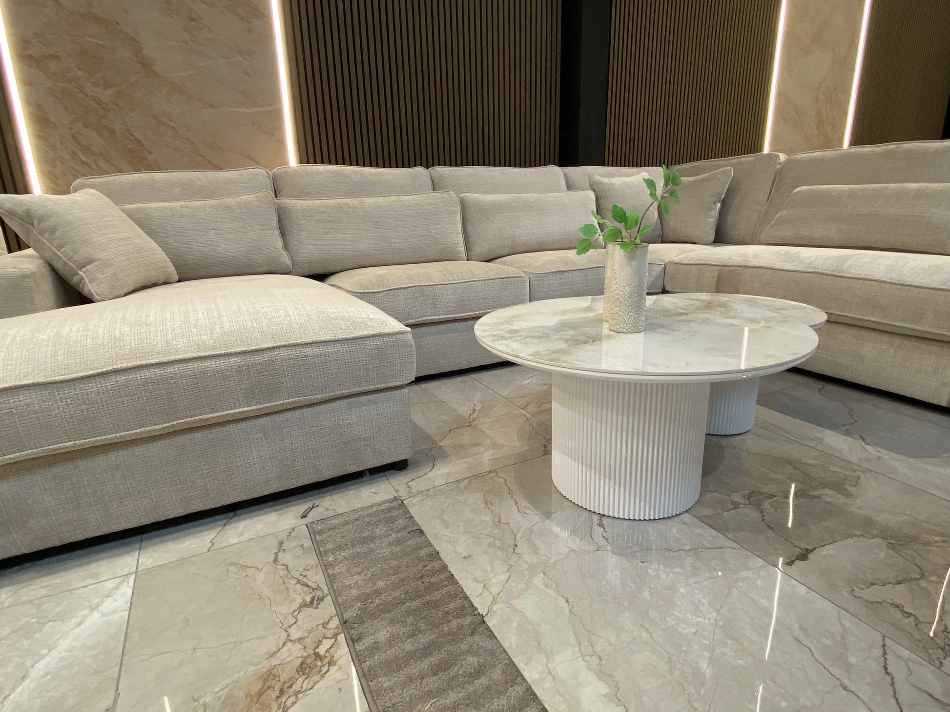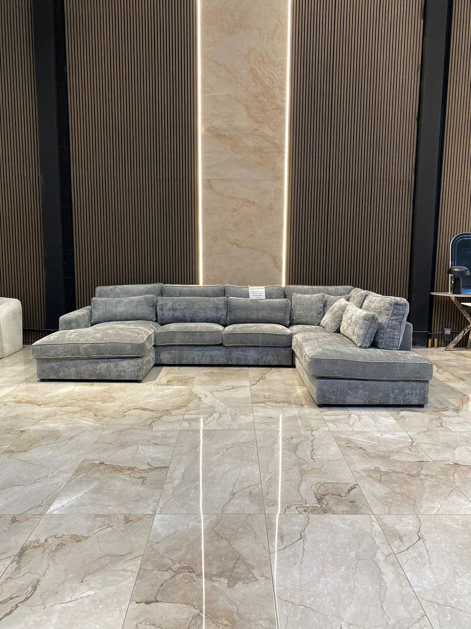 Découvrez notre tout dernier bijou : le canapé en U MARBELLA recouvert du somptueux tissu Marbella avec deux angles possible droit ou gauche.