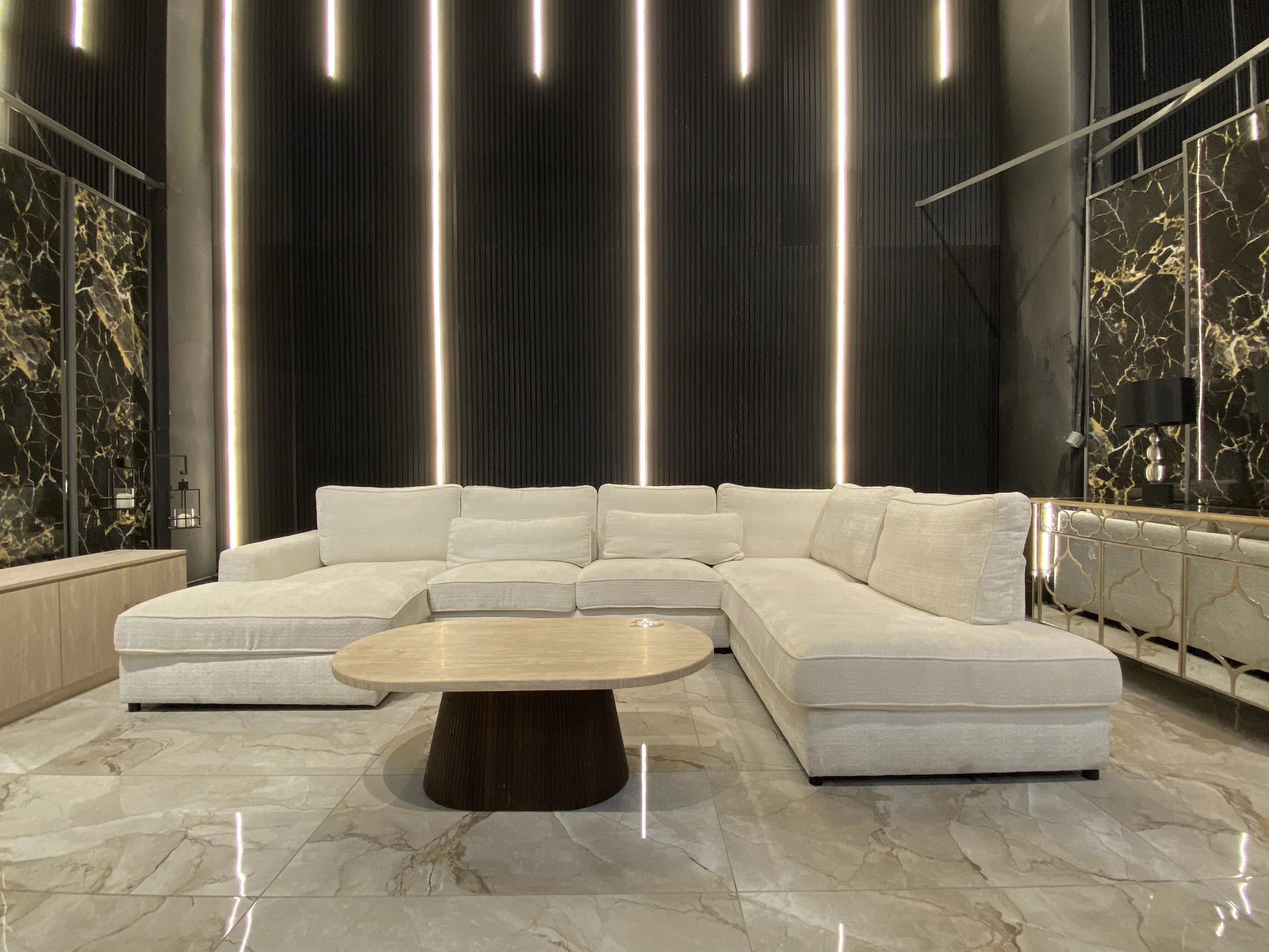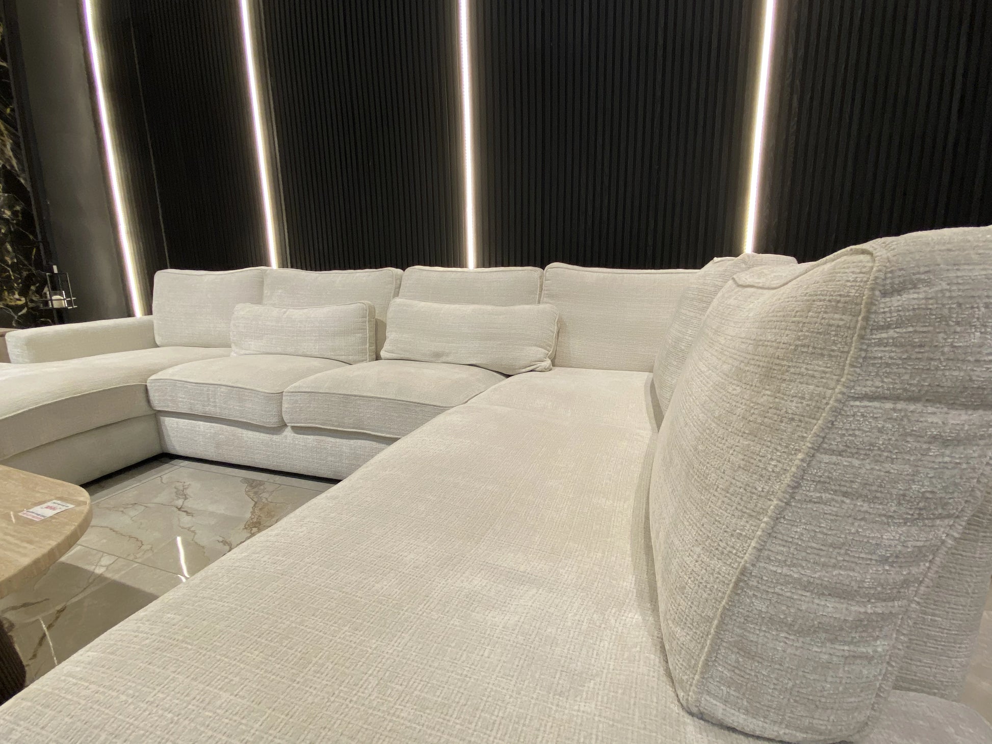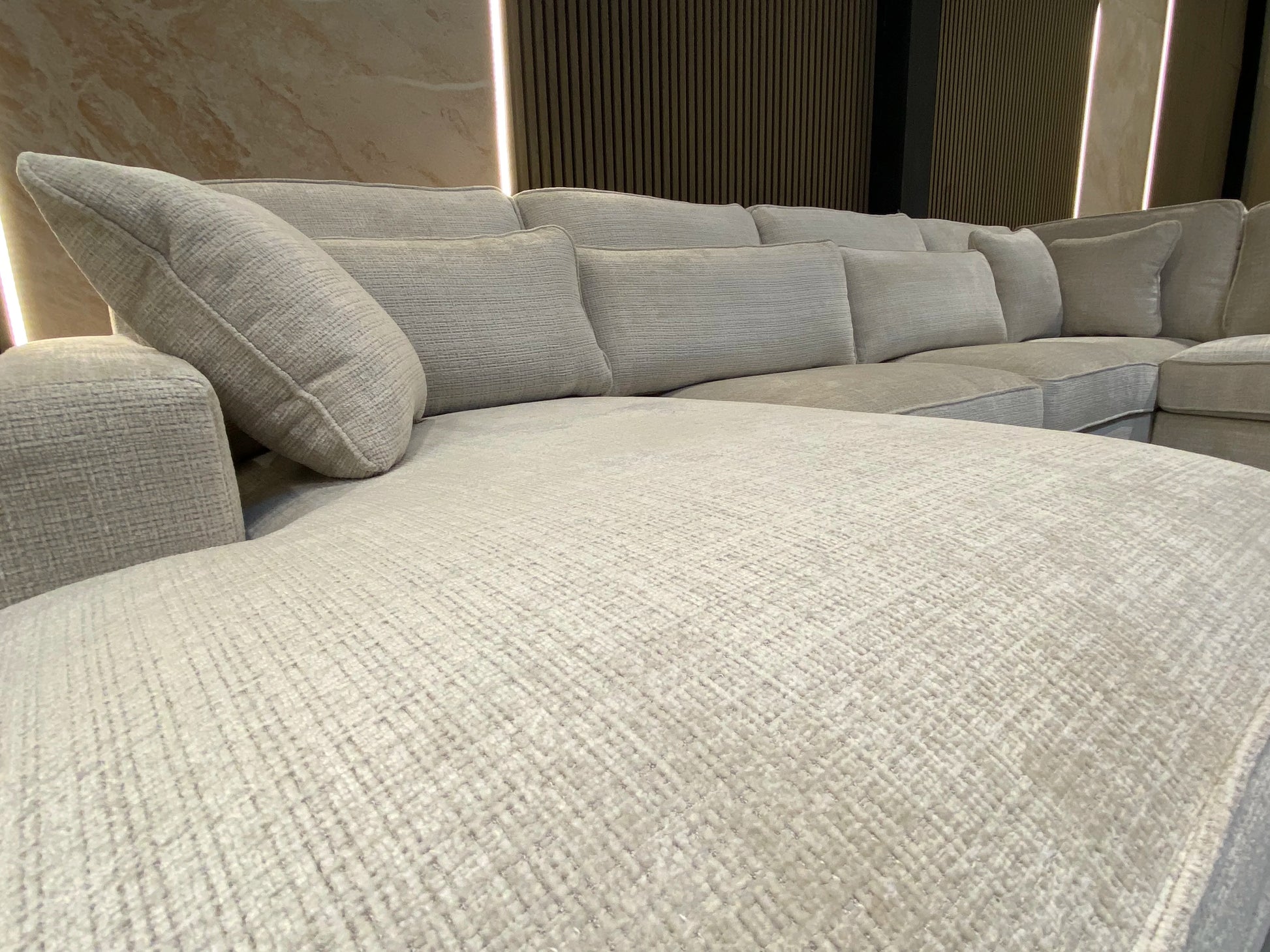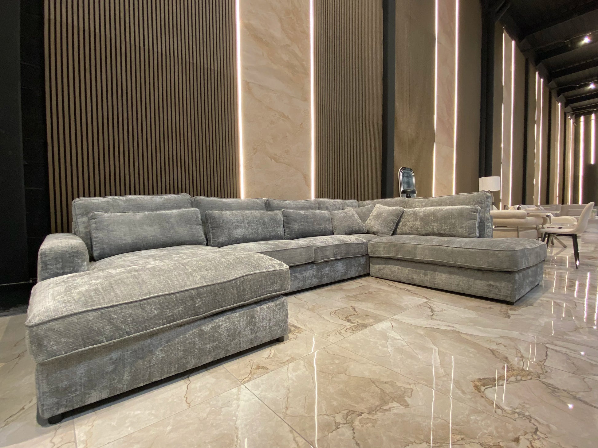 Découvrez notre tout dernier bijou : le canapé en U MARBELLA recouvert du somptueux tissu Marbella avec deux angles possible droit ou gauche.